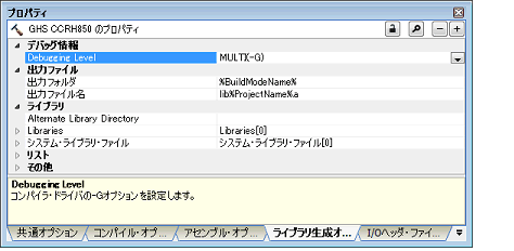 プロパティ パネル:[ライブラリ生成オプション]タブ