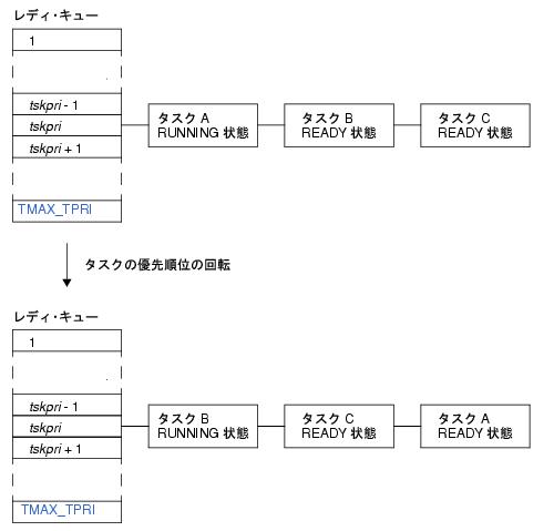 tskpriで指定された優先度に対応したレディ・キューの先頭タスクを最後尾につなぎかえ,タスクの実行順序を明示的に変更します。
