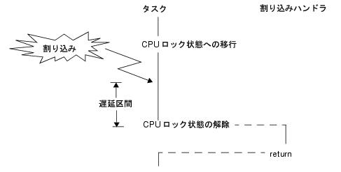 CPUロック状態では,タスクのスケジューリングは禁止され,カーネル管理割り込みもマスクされます。つまり,カーネル管理外割り込みハンドラを除くすべての処理プログラムに対して,排他的に処理を行うことができます。
