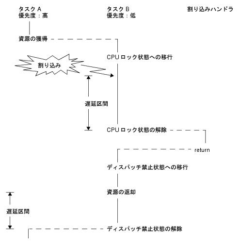 14.2 処理の単位と優先順位」に示したように,非タスク(割り込みハンドラ,周期ハンドラおよびアラーム・ハンドラ)はタスクよりも優先順位が高いため,非タスク処理が始まるとそれが完了するまで,タスクは実行されません。