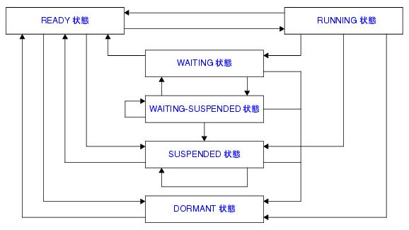 なお,WAITING状態が解除された際にはSUSPENDED状態へ,SUSPENDED状態が解除された際にはWAITING状態へと遷移します。