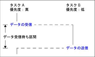 ただし,本サービス・コールを発行した際,対象データ・キューのデータ・キュー領域からデータを読み込むことができなかった(データ・キュー領域にデータが書き込まれていなかった)場合には,データの読み込みは行わず,自タスクを対象データ・キューの受信待ちキューにキューイングしたのち,RUNNING状態からタイムアウト付きのWAITING状態(データ受信待ち状態)へと遷移させます。