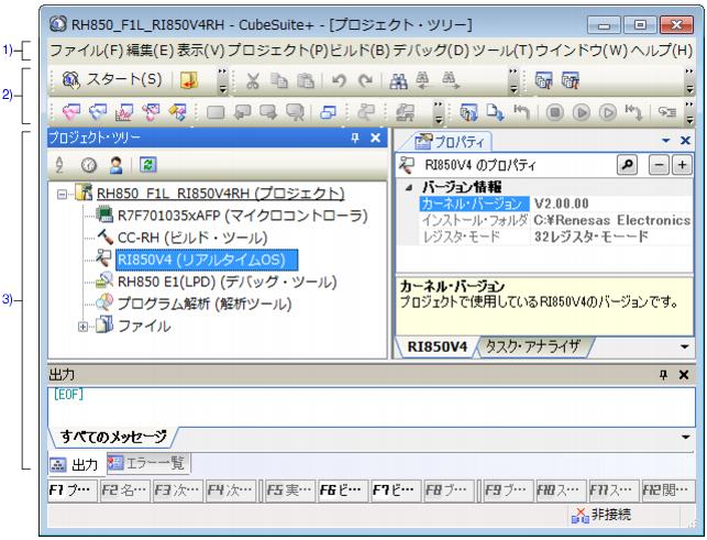 CS+を起動した際,最初にオープンするウインドウであり,本ウインドウからCS+が提供している各種コンポーネント(ビルド・ツール,リソース情報ツールなど)に対する操作を行います。