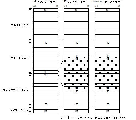 CC-RHでは,3つのレジスタ・モードが提供されています。レジスタ・モードを効率的に指定することにより,割り込み処理時やタスク切り替え時に,一部のレジスタの退避/復帰処理が不要となり,処理速度が高められます。レジスタ・モードの指定は,CC-RHのレジスタ・モード指定オプション(-Xreg_mode)によって行います。この機能は,CC-RHが内部で使用するレジスタの本数を段階的に抑制し,次の効果が期待できます。