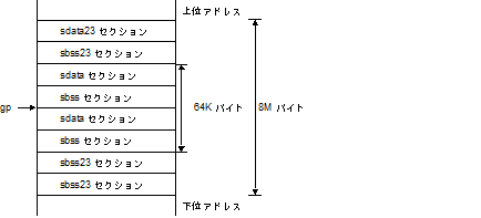 備考 | sdataセクションとsbssセクションをあわせて64Kバイトです。gpはsdataセクションとsbssセクションの中心の位置です。 |