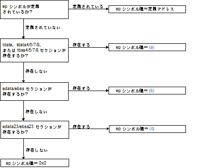 tdata,tdata4/5/7/8,tbss4/5/7/8,edata,ebss,edata23,およびebss23セクションが存在しない場合は,epシンボルのアドレス値を0(ゼロ)として設定します。