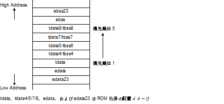 <3> | アドレスの小さい方から,edata,ebssセクションの順で配置し,edata,ebssセクションの間に対象外のセクションが存在している場合 |