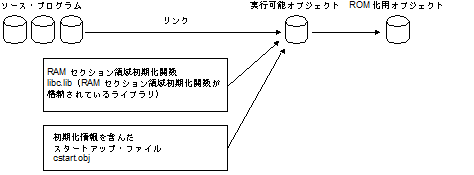 「図 8.3 ROM化用オブジェクトの作成」のようにROM化用オブジェクトを作成すると,RAMセクション領域初期化関数_INITSCT_RHを実行することによって,RAMに配置するデータを,パッキングされたROMからコピーします。