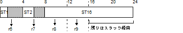 レジスタ渡しの場合,各レジスタ(r6〜r9)へは各々ワード単位にロードされます。
