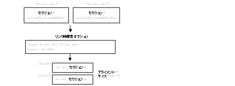 最適化リンケージエディタでは、入力リロケータブルファイル内の同一セクションを結合し、startオプションによって指定されたアドレスに割り付けます。