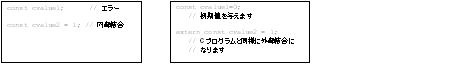constオブジェクトのリンケージは、Cプログラムでは外部結合であるのに対し、C++プログラムでは内部結合になります。また、constオブジェクトは初期値を必要とします。