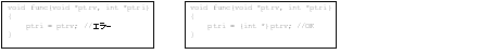 C++プログラムでは、明示的なキャストを用いないと他のオブジェクト型へのポインタ(関数へのポインタ、メンバへのポインタを除く)へ代入できません。
