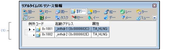 備考  割り込みハンドラ情報(例外コード,起動アドレスなど)の各セルをダブルクリックした際には,割り込みハンドラのソース・ファイルをエディタ パネルに表示し,該当部にキャレットを移動します。