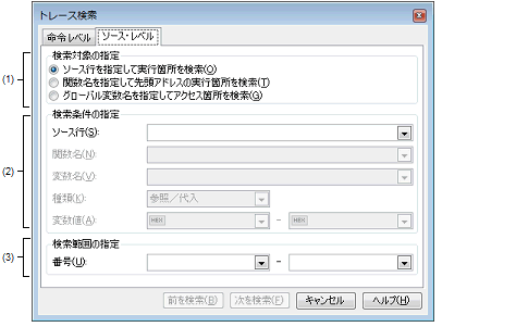 トレース パネルを逆アセンブル表示モードで表示している場合,このタブでソース・レベルの検索を行っても対象を正しく検索することはできません。 |