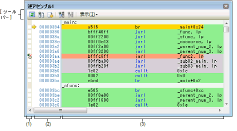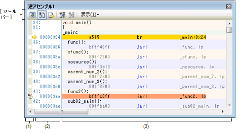 | このパネルの表示モードとして,混合表示モード(デフォルト)と逆アセンブル表示モードを切り替えます(「2.6.2.1 表示モードを変更する」参照)。 | ||