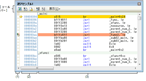 メモリ内容を逆アセンブルした結果(逆アセンブル・テキスト)の表示,ライン・アセンブル(「2.6.4 ライン・アセンブルを行う」参照),命令レベル・デバッグ(「2.8.3 プログラムをステップ実行する」参照),およびコード・カバレッジ測定結果の表示【シミュレータ】(「2.15 カバレッジの測定【シミュレータ】」参照)を行います。
