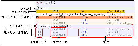 対象となるソース・テキスト行に続き,逆アセンブル結果行を次のように表示します。