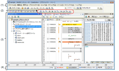 デバッグを行う際は,このウインドウからプログラムの実行制御,および各パネルのオープン操作を行います。