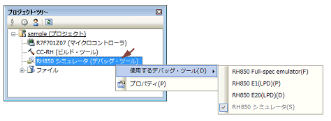 使用するデバッグ・ツールの選択/切り替えは,プロジェクト・ツリー パネル上の[RH850 デバッグ・ツール名(デバッグ・ツール)]ノードを右クリックすることで表示されるコンテキスト・メニューから行ってください。