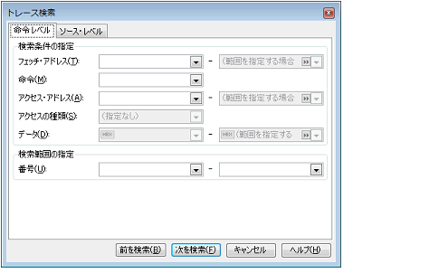 命令レベルでトレース・データの検索を行う場合は,トレース パネルを混合表示モード,または逆アセンブル表示モードで表示している必要があります。 |