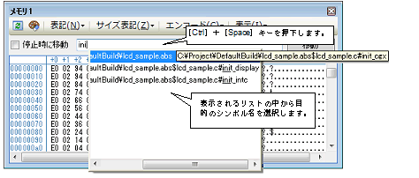 シンボル名の入力補完とは,アドレス式などを入力する際に,プログラム中に存在するシンボル名のリストから1つを選択することにより,ユーザのシンボル名の入力作業を補佐する機能です。