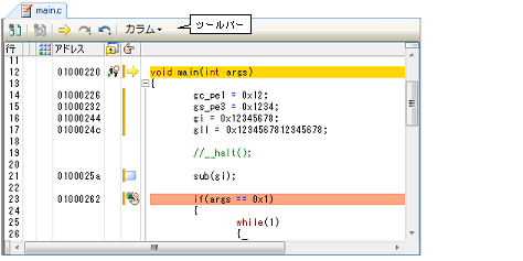 エディタ パネルは,ロード・モジュール・ファイルが正常にダウンロードされると,指定された位置(「2.5.1 ダウンロードを実行する」参照)のソース・テキストを表示した状態で自動的にオープンします。