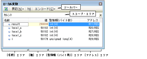 なお,各エリアの見方,および機能についての詳細は,ローカル変数 パネルの項を参照してください。