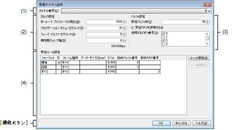 このダイアログで設定した受信チャネルの設定をCAN受信デバッグ パネル【Full-spec emulator】【E1】【E20】の[受信チャネル設定]エリアに反映します。 |
