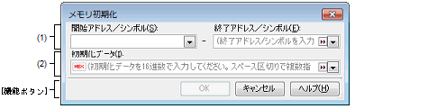 メモリ値を初期化するアドレス範囲を[開始アドレス/シンボル]と[終了アドレス/シンボル]に指定します。それぞれのテキスト・ボックスにアドレス式を直接入力するか(最大指定文字数:1024文字),またはドロップダウン・リストにより入力履歴項目(最大履歴個数:10個)を選択します。