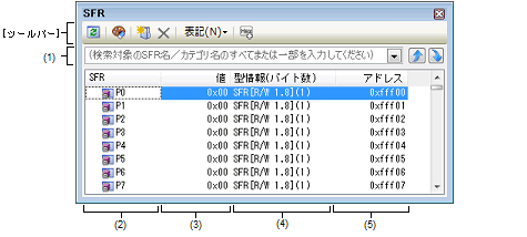 SFRの内容の表示,および値の変更を行います(「2.9.3 SFRを表示/変更する」参照)。