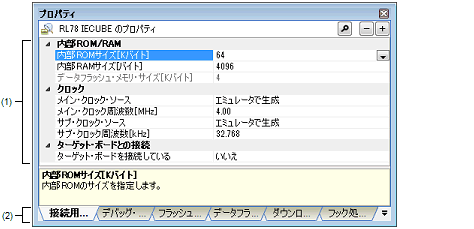プロジェクト・ツリー パネルで選択しているデバッグ・ツールについて,カテゴリ別に詳細情報の表示,および設定の変更を行います。