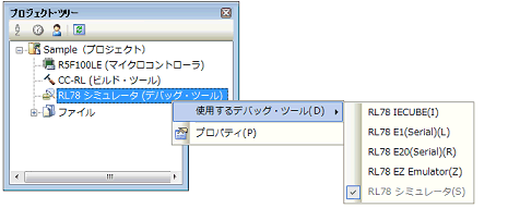 使用するデバッグ・ツールの選択/切り替えは,プロジェクト・ツリー パネル上の[RL78 デバッグ・ツール名(デバッグ・ツール)]ノードを右クリックすることで表示されるコンテキスト・メニューから行ってください。