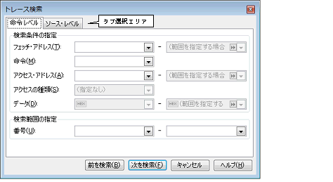 なお,タブ選択エリア上のタブを選択することにより,命令レベル,またはソース・レベルでトレース・データを検索することができます。