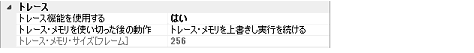 設定は,プロパティ パネルの[デバッグ・ツール設定]タブ上の[トレース]カテゴリ内で行います。