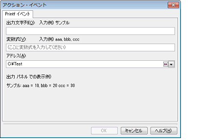 アクション・イベントの1つであるPrintfイベントを設定することにより,プログラムの実行を任意の箇所で一瞬停止させたのち,ソフトウエア処理によりprintfコマンドを実行させ,指定した変数式の値を出力 パネルに出力することができます。