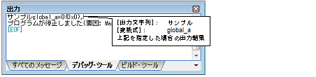 出力 パネルの[デバッグ・ツール]タブでは,指定した変数式の値が次のように出力されます(「図 A.33 Printfイベントの出力結果フォーマット」参照)。