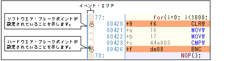 また,対象アドレスにブレーク・イベント(ハードウエア・ブレーク・イベント/ソフトウエア・ブレーク・イベント)が設定されたとみなされ,イベント パネルで管理されます(「2.15 イベントの管理」参照)。