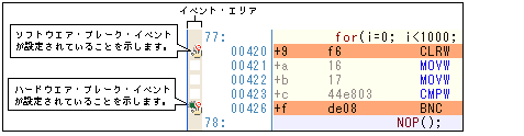 ブレーク・イベント(実行系)が設定されると,設定した箇所に次のイベント・マークが表示され,ソース・テキスト行/逆アセンブル・テキスト行が強調表示されます。