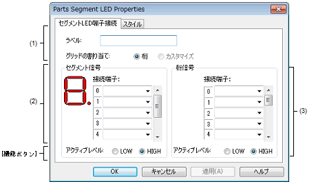 入出力パネル ウインドウの接続部品の一つである7セグメントLED,および14セグメントLEDの端子接続情報の設定,変更を行います。