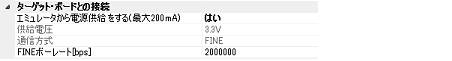 ターゲット・システム上でのFINE信号の配線長や配線方法によっては,選択したFINEボーレートで通信できない場合があります。このFINEボーレートを下げることによって,通信が出来るようになる場合があります。 |