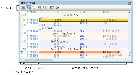 なお,各エリアの見方,および機能についての詳細は,逆アセンブル パネルの項を参照してください。