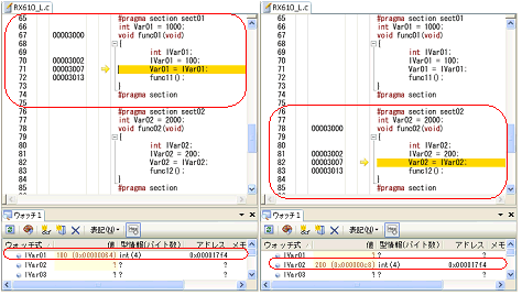 次に,[オーバーレイ・セクション]プロパティにおいて,図 2.96 オーバーレイ・セクションの配置に記載している“ram01”を優先セクションとして選択した場合(左側),および“ram02”へ変更した(右側)場合の例を示します。