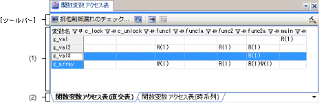 変数にアクセスしている関数を直交表で表示する[関数変数アクセス表(直交表)]タブと,排他制御チェック・ツールによって計測された排他制御の時系列情報を表示する[関数変数アクセス表(時系列)]タブの2つがあります。