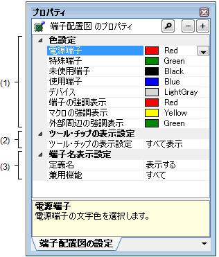 プロジェクト・ツリー パネルで選択した[端子配置図]に対応した情報(色設定,ツール・チップの表示設定,端子名表示設定)の表示,および設定の変更を行います。