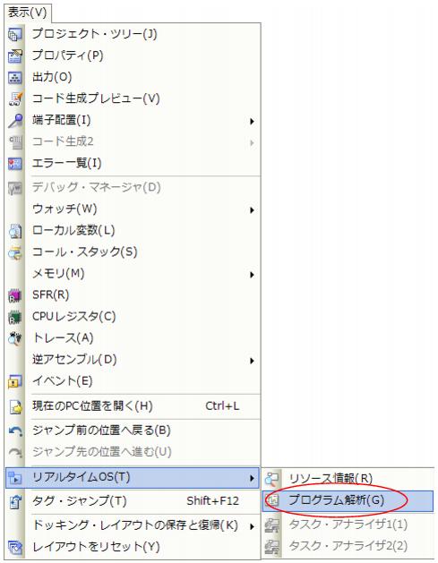 [表示]メニュー→[リアルタイムOS]→[プログラム解析]を選択すると,プログラム解析ツールが起動します。