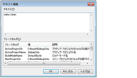 ここでは,ビルドの実行により出力された中間ファイル/生成ファイルなどを削除するコマンドを設定してください。
