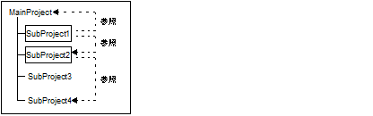 SubProject1の依存プロジェクトとしてMainProject,SubProject2を設定し,SubProject2の依存プロジェクトとしてSubProject4を設定した場合,ビルド順は以下のようになります。 |
