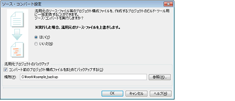 また,流用元のプロジェクトのソース・ファイル,およびプロジェクト一式をバックして保存する場合は,[コンバート前のプロジェクト構成ファイルをまとめてバックアップする]をチェックし,保存先を指定します。
