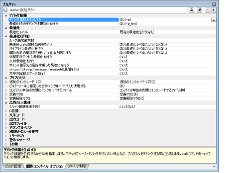 本タブでは,1つのCソース・ファイルに対して,次に示すカテゴリごとに詳細情報の表示,および設定の変更を行います。