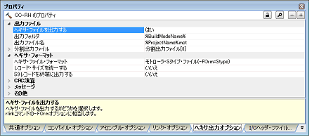 ヘキサ出力フェーズに対するオプションを設定するには,プロジェクト・ツリーでビルド・ツール・ノードを選択し,プロパティ パネルの[ヘキサ出力オプション]タブを選択してください。